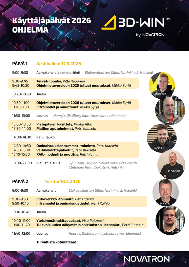 Home › 3D-Win Käyttäjäpäivät Tervetuloa Novatronin 3D-Win Käyttäjäpäiville 17.-18.3.2026! Vuoden tärkeimmät infra- ja paikkatietoalan ammattipäivät tulevat jälleen! Novatronin 3D-Win Käyttäjäpäivillä käydään läpi 2025 ja 2026 -ohjelmistoversioiden muutoksia ja uusia ominaisuuksia, joiden avulla aineistojen käsittely on entistä helpompaa ja nopeampaa. Aika: 17.-18.3.2026 Paikka: Luennot: Gilda sali 1, Elokuvateatteri Gilda, Narinkka 2, 00100 Helsinki Majoitus ja illallinen: Original Sokos Hotel Presidentti, Eteläinen Rautatiekatu 4, 00100 Helsinki Ohjelmassa: 3D-Win™ 2025 ja 2026 -ohjelmistoversioiden ominaisuuksien esittelyä Case-esimerkkejä ja mielenkiintoisia luentoja Verkostoitumista alan ammattilaisten kesken Vapaamuotoinen iltaohjelma Liput sisältävät lounaat, kahvit ja illallisen Majoitus Original Sokos Hotel Presidentissä edullisesti sopimushintaan 9.3.2026 mennessä tehdyille varauksille: 145€/1hh (ovh. 158 EUR) tai 165€/2hh (ovh. 175 EUR). Sopimushinta aktivoituu varatessa koodilla: NOVATRON (suoraan varatessa) ja BNOVATRON (varaus verkossa: Linkki ) Novatron pidättää oikeuden muutoksiin. Mitä? Novatronin 3D-Win™ asiakkaiden arvostamat Käyttäjäpäivät on perustettu ohjelmistokäyttäjien kohtaamispaikaksi, jossa käsitellään ajankohtaisia aiheita, ohjelmiston uusia ja vanhoja toimintoja, sekä vastataan käyttäjien kysymyksiin. Kenelle? Tapahtuma on tarkoitettu kaikille 3D-Win-ohjelmiston käyttäjille kokemus- ja taitotasoon katsomatta. Varaa paikkasi nyt edulliseen hintaan! Toimi nopeasti – 10 ensimmäiselle ilmoittautujalle erikoislahja! Kahden päivän lippu: 499 EUR + ALV 25.5% per osallistuja Hanki lippusi nyt! PeruutusehdotOsallistumisen voi peruuttaa maksutta viimeistään yli kuukautta (30 päivää) ennen tapahtumaa. Jos peruutus tehdään 1 kuukauden (30 päivän) sisällä ennen tapahtumaa, perimme 224 euron peruutusmaksun. Jos peruutus tehdään kahden (2) viikon sisällä ennen tapahtumaa tai osallistuja jättää saapumatta tapahtumaan, veloitamme 100 % osallistumismaksusta. Novatronin 3D-Win™ Käyttäjäpäivät kokoavat alan asiantuntijat yhteen 3D-Win™ asiakkaiden arvostamat käyttäjäpäivät on perustettu ohjelmistokäyttäjien kohtaamispaikaksi, jossa käsitellään ajankohtaisia aiheita, ohjelmiston uusia ja vanhoja toimintoja, sekä vastataan käyttäjien kysymyksiin. Tapahtuma on tarkoitettu kaikille 3D-Win™ käyttäjille kokemus- ja taitotasoon katsomatta. Käyttäjäpäivillä luot kullanarvoisia kontakteja muihin ohjelmistokäyttäjiin ja kuulet parhaimmat käyttövinkit alan konkareilta, asiantuntijoilta ja kutsuvierailta. Miksi osallistua? Monipuolinen kattaus käyttäjälähtöisiä esityksiä Tapahtuma on erinomainen paikka verkostoitua, tavata muita ohjelmiston käyttäjiä ja jakaa ajatuksia niin 3D-Winin käytöstä kuin itse alastakin Voit antaa henkilökohtaisesti kehitysideoita ohjelmiston kehittäjille Tapahtumassa käydään läpi ohjelmiston uusia toimintoja, jotta saat ohjelmistosta parhaan hyödyn irti Pääset kuulemaan ohjelmiston käytöstä monesta eri näkökulmasta ja sen tuomista mahdollisuuksista eri toimialoille Kysy lisätietoa Ville Reponen Myyntipäällikkö, 3D-Win +358 40 018 6844 ville.reponen@novatron.fi
