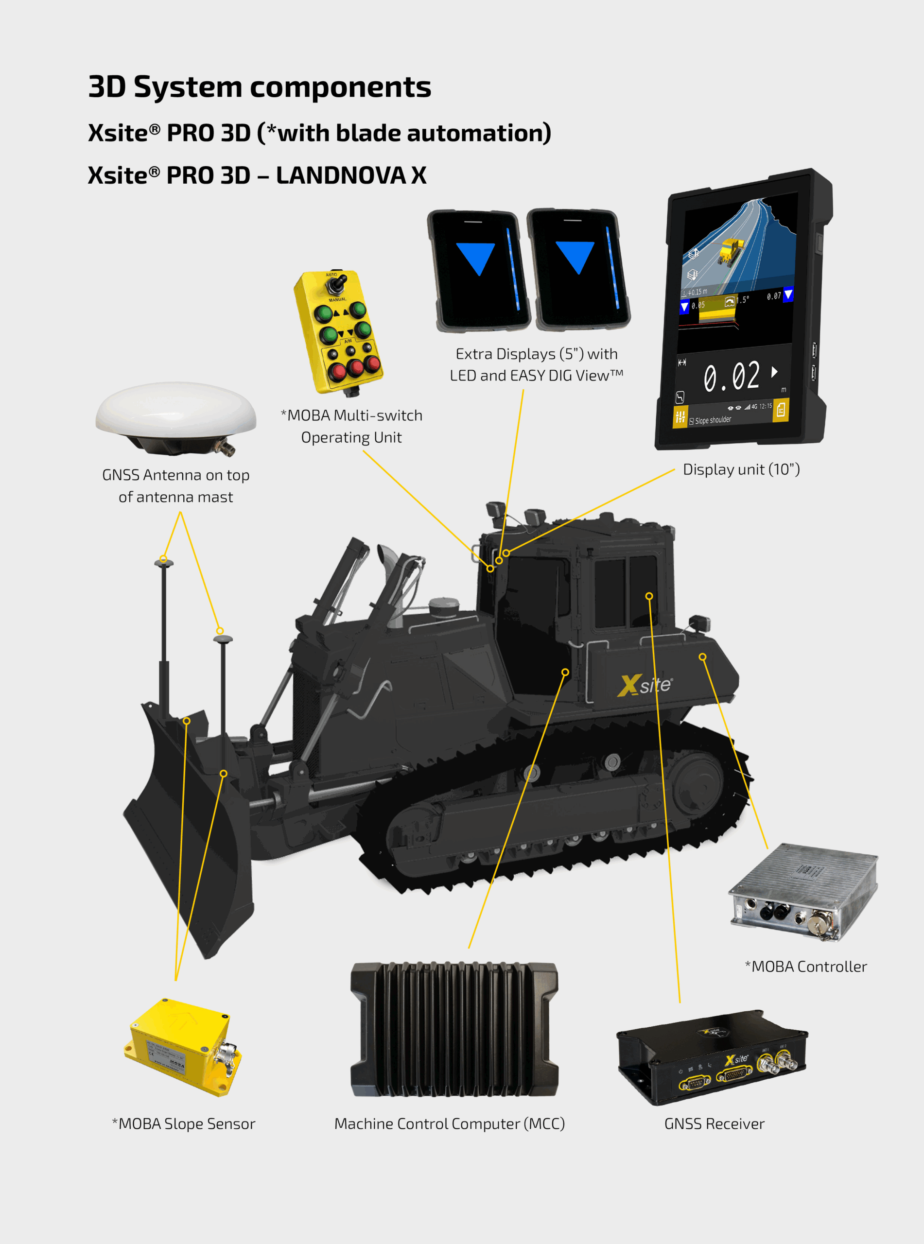 3D Machine Control for Dozers Home › Xsite Machine Control › Machine control for dozers Boost your work and set the surfaces at the right level in one go! The Xsite® PRO 3D machine control system makes working with a dozer more effective and reduces your surveying, material, and fuel costs. The system guides the operator to set structural layers to the right elevation in one go. Work with centimeter accuracy without unnecessary interruptions. No over & under cuts Know exactly how much to cut or fill. Material and transportation costs decrease as the use and transportation of extra materials are no longer needed. Cloud Connection Always work with the latest project plans. Using the Xsite® MANAGE cloud service, 3D models are uploaded to the system automatically, so you can concentrate on productive work. INCREASE EFFICIENCY The work gets done more efficiently and quickly as the operator can concentrate on productive work as there’s no need for manual grade checking. Xsite® PRO 3D for dozers With the help of the machine control system, the operator will find it easy to tackle any task. The large 8,4″ touch screen with clear and illustrative graphics enables the operator to easily monitor the difference in the elevation of the blade and the target surface. Different functions of the Xsite® PRO 3D are designed as easy to use as possible. For example, selecting and changing the active design model can be done by just one touch! Features Large 10″ touchscreen with clear graphics and optional XD3 Extra Displays with LED Intuitive user interface Fast & accurate satellite positioning High-speed sensors with IMU technology Remote support and Cloud connection Xsited to learn more? Find your local dealer! Find your local dealer