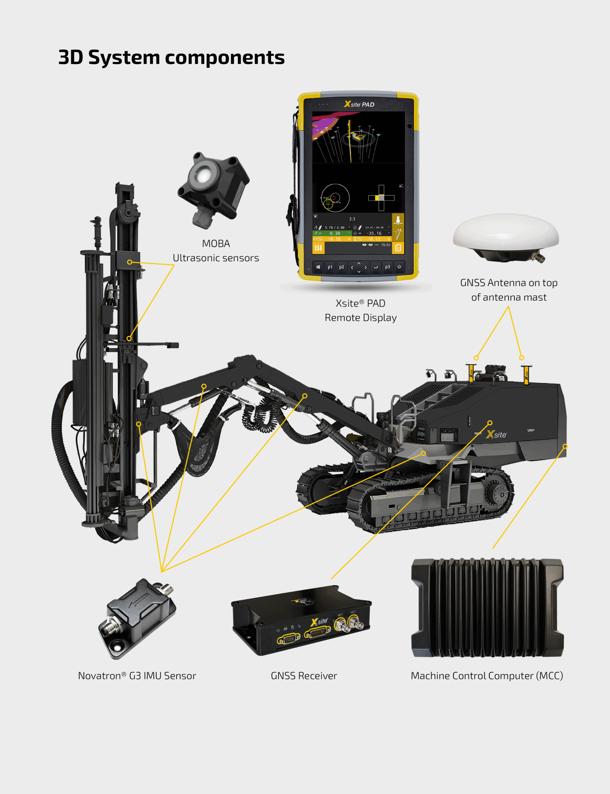 Xsite® DRIll RD 3D Machine Control System with Remote Display for Non-Cabin Surface Drills Home › Xsite Machine Control › Machine Control For Drills › Xsite DRILL RD Work easier, faster, and safer with Xsite® Machine Control! Xsite® DRILL RD is a high-precision satellite-based drilling and hole navigation system tailor-made for non-cabin drill rigs. The system helps the drill operator navigate to the correct hole position and assists in achieving the correct drilling angles and depth quickly and safely. Find Your Local Dealer! Save time and increase hole quality Machine Control helps to eliminate positioning and orientation errors. The system guides the operator to navigate to the right hole and reach the right depth with correct inclination. Fast and Accurate Documentation Wireless data transfer and cloud connection speed up the drilling process and enable real-time documentation and reporting of work. Savings on total cost of ownership Xsite Machine Control improves the efficiency of the entire production chain and reduces overall operating costs (TCO). Xsite® DRILL RD – Features Wireless Transfer of Design Files A surface model, design model, or drill plan created with design software can be transferred wirelessly from the office to the Xsite® DRILL RD system as a file or as GPS coordinate points. Drill Plans The operator can create a drill plan on-site using the system, either based on an imported surface model or without a surface model. The holes in the drill diagram can be designed as a group or individually. Versatile editing tools also allow a separate design of holes. Navigation and Positioning The system’s reach indicator displays the reach and coverage of the drill’s boom relative to the drill’s position and the drill plan, making the positioning and hole navigation quick and easy. The AutoSnap function automatically selects the nearest hole to be drilled. The hole can also be selected from the drill diagram manually. Versatile Drilling View The drilling view shows the current drilling speed, the cumulative penetration rates in the different rock layers as a visual graph, as well as the drilling depth and borehole readiness. Auto-stop to the target depth improves hole quality and makes working easier and safer. Documentation of Work Thanks to the two-way wireless cloud connection, post-drilling hole data (as-built) can be returned to the office for review or quality reporting. In addition to Xsite MANAGE Cloud Service, the system supports 3rd party services, e.g., Infrakit, Gemini, and BlastMaster. Powerful components, wide features Rugged, 7″ Wireless Operation Panel (IP67) Drill plan wizard Auto-stop to target depth Wireless data transfer Support for IREDES, LandXML, .DXF and .GT file formats Support for 3rd party services (E.g., Infrakit, Gemini, BlastMaster) Remote support Xsite® DRILL RD reliably hits the mark Kjell Foss, a Norwegian company specializing in blasting and drilling services, works in demanding conditions that put the capabilities of the Xsite® DRILL RD to the test. Xsited to learn more? Find your local dealer! Find your local dealer