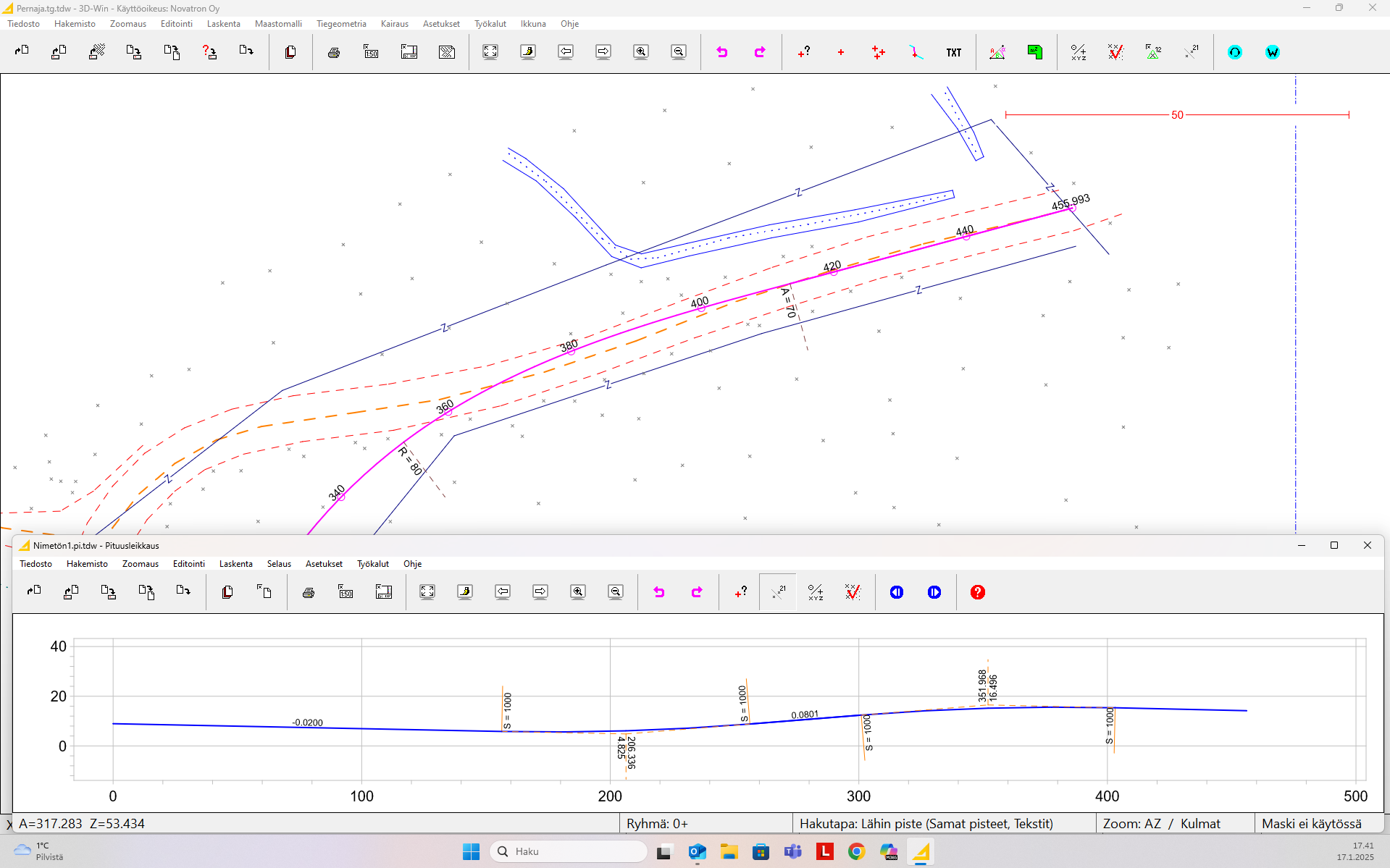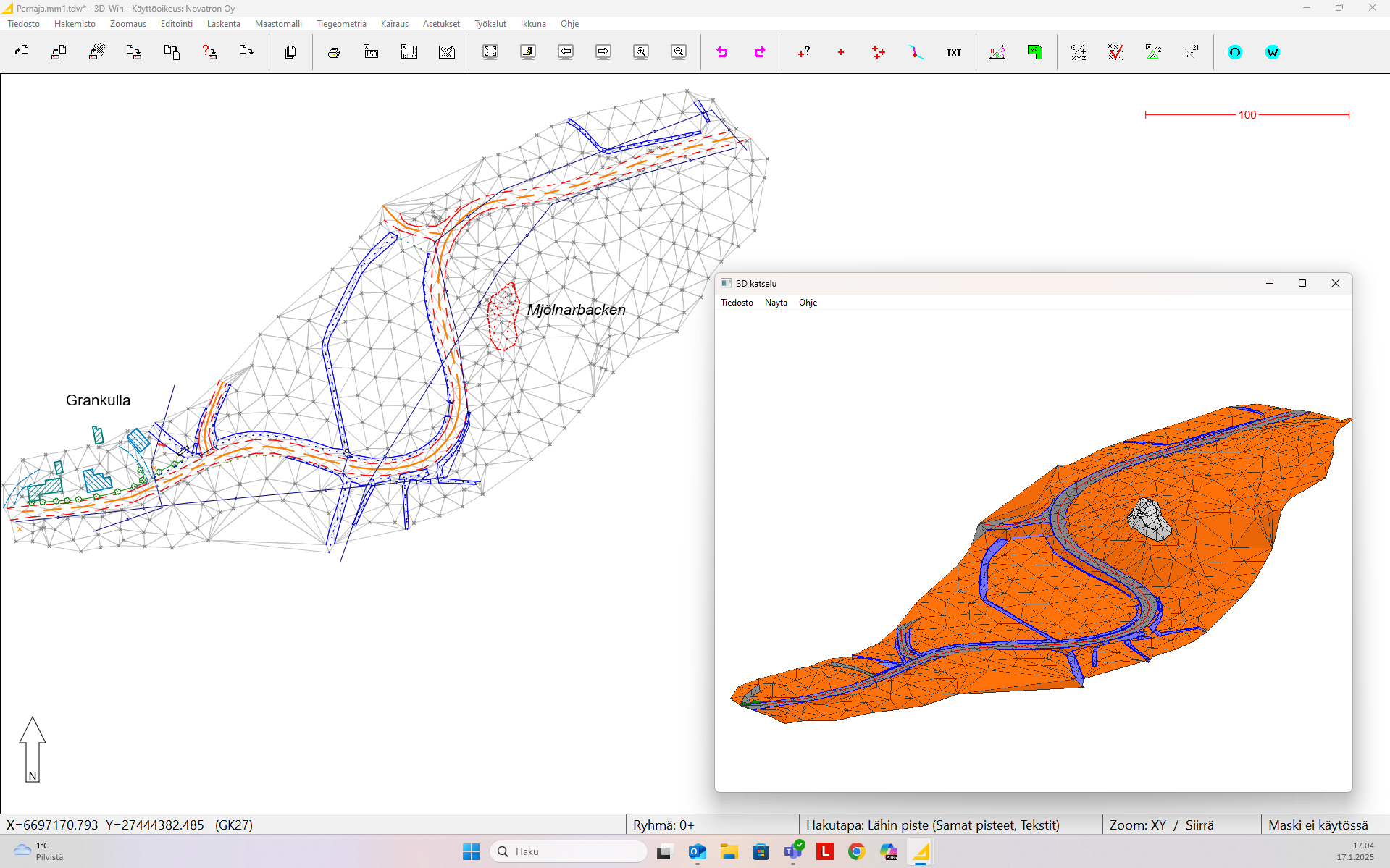 Home › Tuotteet › Ohjelmistot › 3D-Win – Paikkatiedon monitoimityökalu › 3D-Win perusohjelma 3D-Win™ perusohjelma 3D-Win on kotimainen mittaus – ja suunnitelmatiedon tuottamiseen ja käsittelyyn tarkoitettu ohjelmisto, joka voidaan asentaa yksittäisiin tietokoneisiin tai mihin tahansa Windows-verkkoon. Monipuolisten tarkastus-, editointi- ja laskentaominaisuuksiensa vuoksi 3D-Win soveltuu monen ammattiryhmän työkaluksi. Ohjelmisto sisältää myös laajan formaatinmuunninvalikoiman aineistojen sisäänlukuun ja uloskirjoitukseen. Olet sitten kartoittaja, mittauspäällikkö, paikkatietoinsinööri tai infran suunnittelija, 3D-Win on sinun monitoimityökalusi aineistojen käsittelyyn. Ota yhteyttä myyntiin Kaikki ominaisuudet ammatilaiselle Tarkastus Editointi Laskenta Aineiston tarkastelu ja käsittely Saat helposti luotua yhteenvetoraportin sisäänluetun tiedoston sisällöstä. Tulostiedostosta näet esimerkiksi vektoritiedostojen pisteiden ja tekstien määrät, viivojen pituudet koodeittain eroteltuna, käytetyt pinta- ja lajikoodit sekä ominaisuustiedot. Aineistoa voidaan katsella eri suunnista ja kohteiden editointi on mahdollista myös kolmiulotteisesti. Pisteiden koodauksen käsittelyyn on tehokkaat toiminnot ja pisteille voidaan tallettaa käytännöllisesti katsoen rajaton määrä vapaamuotoista ominaisuustietoa. Koodaus voidaan muuntaa helposti eri asiakkaiden järjestelmiä vastaavaksi koodimuunnostaulukoiden avulla. Formaatit Tiedostoja voidaan lukea ja kirjoittaa ohjelmiston oman tiedostomuodon lisäksi useissa eri formaateissa. Lisäksi laaja käyttäjän määriteltävissä oleva teksti- / CSV-muunnin, jolla hallitset tiedonsiirron mittalaitteista ja työkoneohjausjärjestelmistä 3D-Win-ohjelmistoon . Perusohjelmisto sisältää aikaisemmin erillisinä moduuleina olleet CAD- ja GIS-muuntimet. Muunninvalikoimaan kuuluu noin 50 vektoriformaattia, 20 rasteriformaattia ja 10 tiegeometriaformaattia, esimerkiksi LandXML, InfraModel 4, LAS/LAZ, MML ETRS, Excel, Geo, Trimble, Leica ja Geonic Virheiden ja puutteiden korjaus Tiedoston tarkistus -toiminnolla luot raportin maastomallin tai infrahankkeen suunnitelmamallin virheistä ja puutteista. Voit hyödyntää virheiden ja puutteiden korjaamiseen Tiedoston korjaus -toimintoa, joka korjaa automaattisesti vektoritiedostosta löytyviä virheitä. Toisaalta voit hyödyntää korjaamiseen kaikkia editointityökaluja, jolloin editointi tapahtuu graafisesti ja se voidaan kohdistaa joko yksittäisiin pisteisiin ja viivoihin, kokonaisiin tiedostoelementteihin tai eri hakutavoilla valittuihin aktiivisiin kohteisiin. Pisteitä ja viivoja voidaan poistaa, lisätä ja editoida useilla eri editointi- ja laskentaominaisuuksilla. Geodeettinen laskenta Käytössäsi on monipuoliset mutta helpot laskentatoiminnot. Määräät itse, miten laskenta toimii, ja mitä arvoja haluat ruudussa ja tulostiedostossa näkyvän. Laskentatoiminnot sisältävät kaikki yleisimmät mm. kaavalaskennan käyttämät geodeettiset laskennat ja leikkaukset, pinta-alan laskennan, koordinaatistomuunnokset sekä pisteiden vertailutoiminnot. Voit hyödyntää laskennan referenssitietona pisteitä, suoria, taiteviivoja ja geometrialinjoja. Laskennan tulokset tallentuvat automaattisesti tekstimuotoiseen tulostiedostoon. Halutessasi voit tallentaa laskentatulokset pisteiden ja viivojen ominaisuustiedoksi. Model Tool -lisäosa Sisältää maastomalliominaisuudet, rakennesuunnittelun ja kairausdiagrammit. Lue lisää Asiakastarina Konetyö Koskimäki Oy on tehnyt Novatronin tuotteiden avulla Eurajoella sijaitsevassa Oosinselän tuulipuistossa kolmelletoista tuulivoimamyllylle perustukset ja kentät. Tuulivoimapuiston rakentaminen vaatii tarkkaa työtä ja edistyneitä työkaluja, jotta energiatehokkuus ja luontoarvojen säilyttäminen voidaan maksimoida. Ota yhteyttä Ville Reponen Myyntipäällikkö, 3D-Win +358 40 018 6844 ville.reponen@novatron.fi